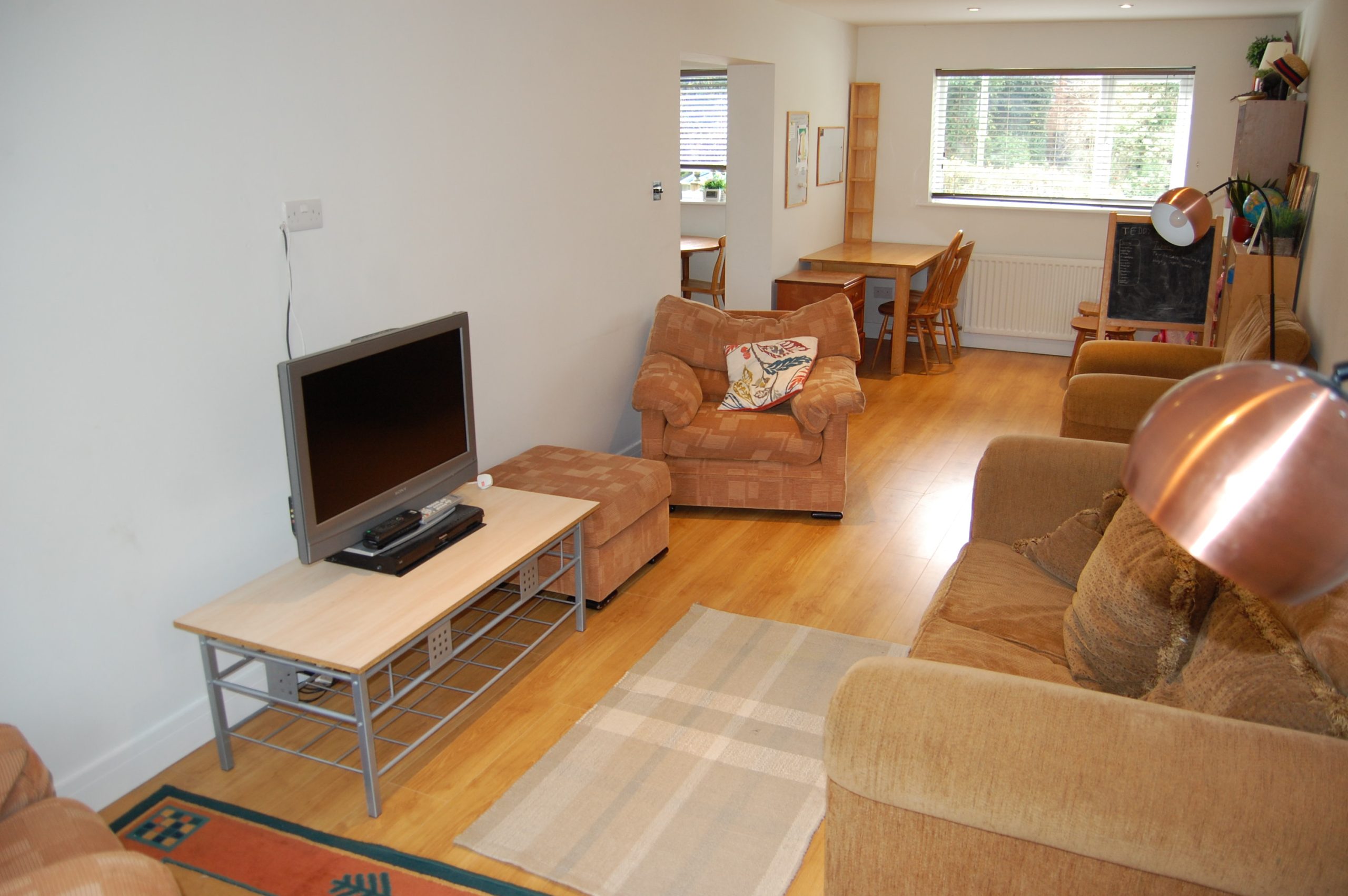 - Large living room with armchair seating, TV and desk