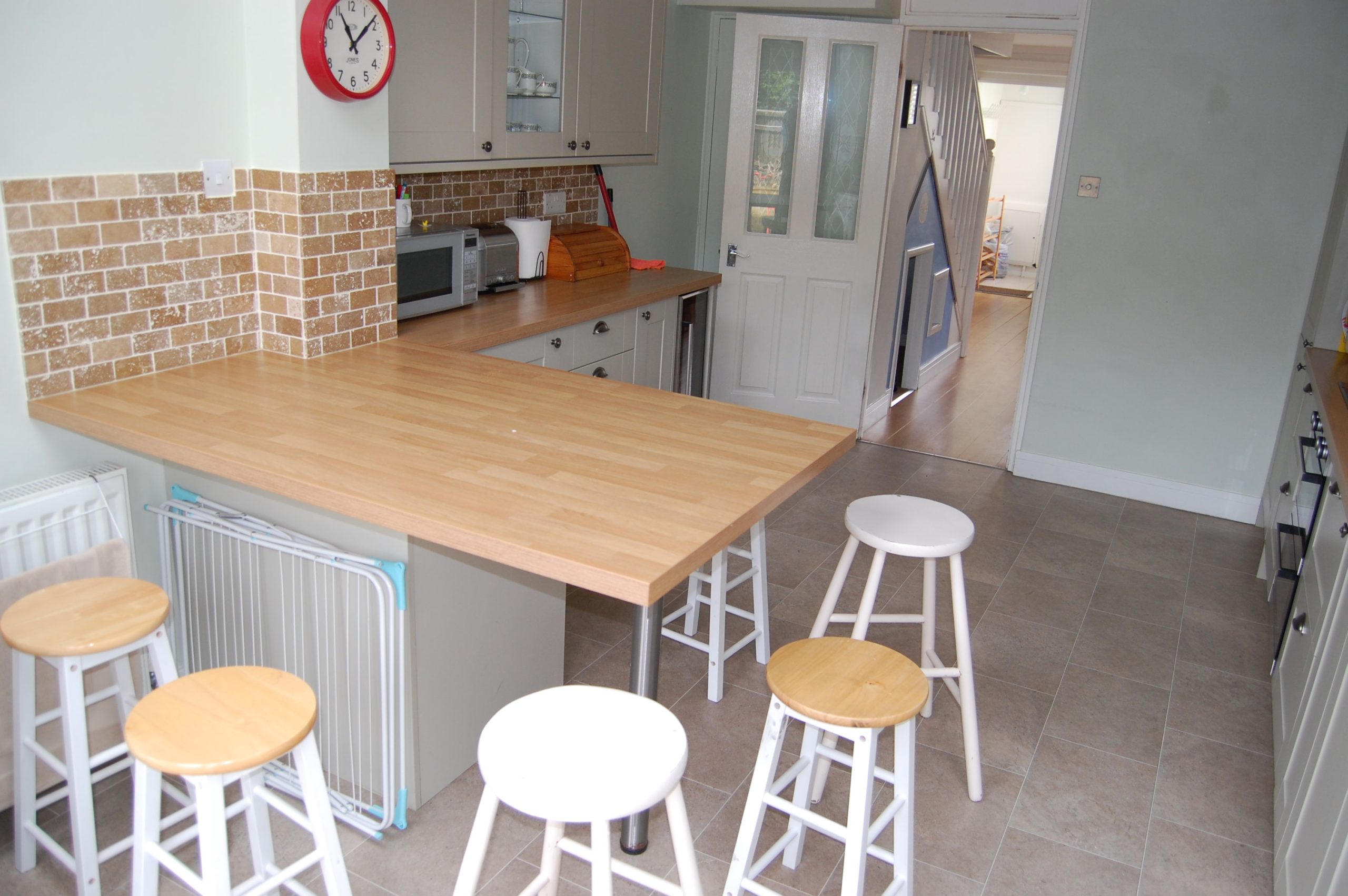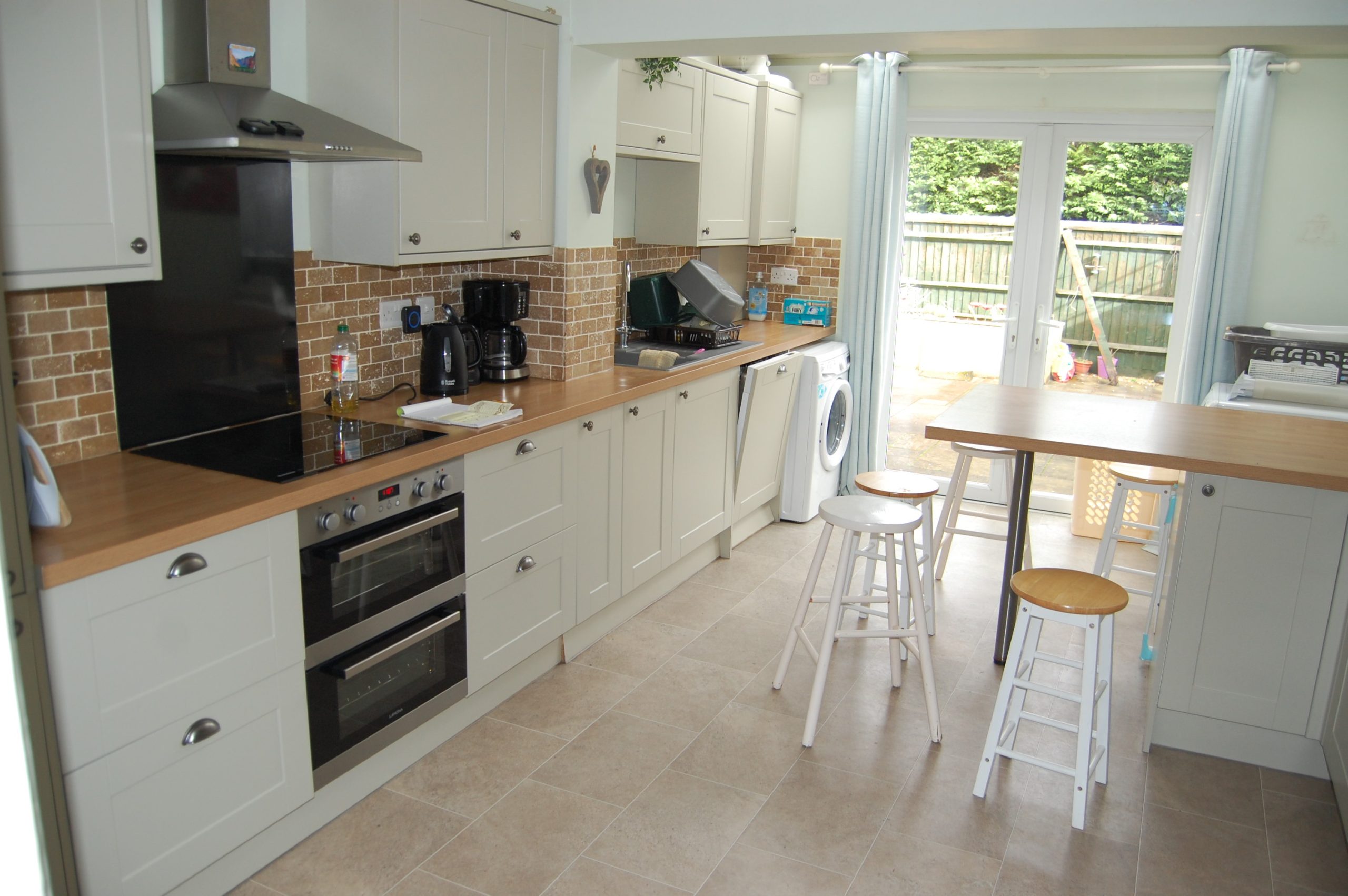 - Kitchen with breakfast bar, washing machine, dishwasher, tumble dryer, microwave and fridge/freezer