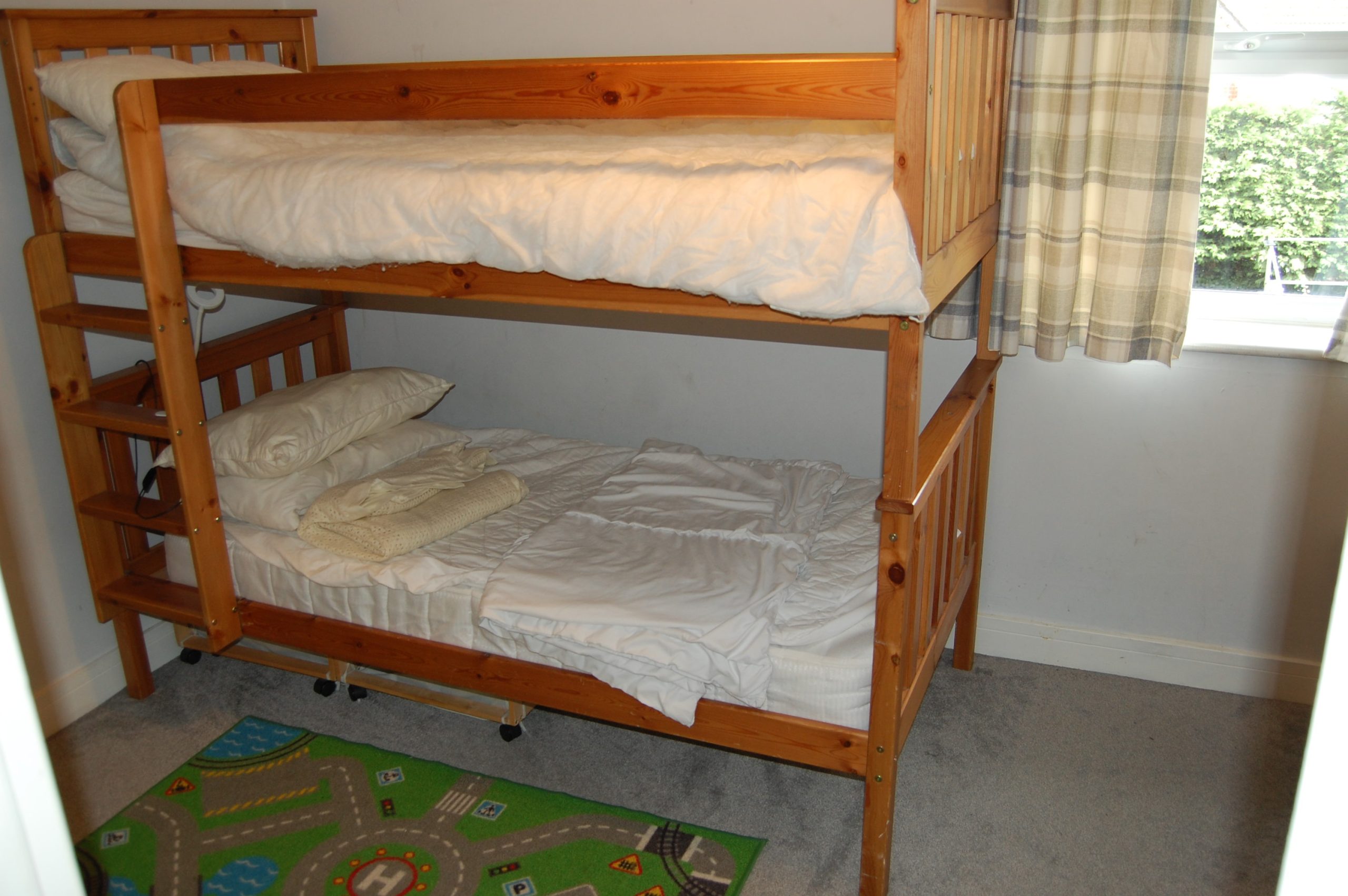 It can accommodate up to seven people. The main bedroom has a double bed and en suite shower room, the second bedroom has bunk beds, the third bedroom has twin beds and the fourth bedroom has a single bed. There are also a couple of floor mattresses that can be used for hosting occasional visitors.